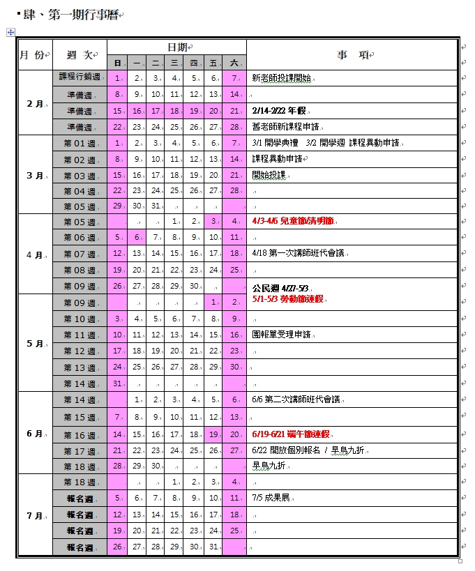 開學期間:3/2 (星期一)~3/8 (星期日)陸續開始上課